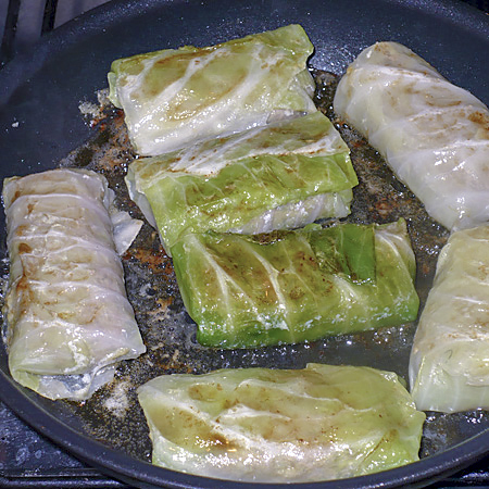 - В сковороде с толстым дном нагреть сливочное масло и обжарить голубцы с обеих сторон до легкого золотистого цвета.