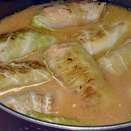 - Плотно уложить обжаренные голубцы в кастрюлю.