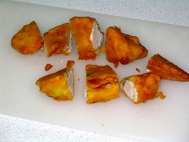 - Окунуть кусочки курицы в кляр и обжарить во фритюре с двух сторон до готовности.